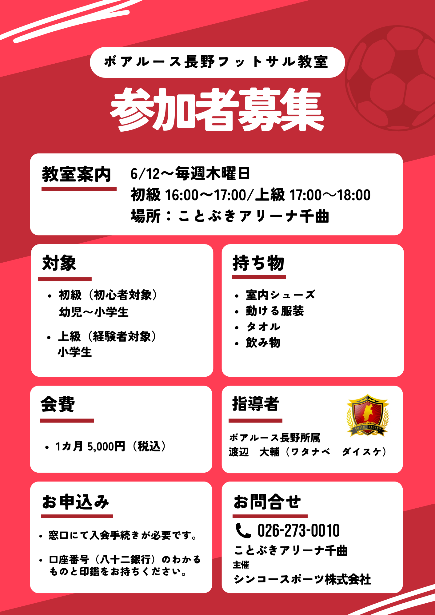 ことぶきアリーナ千曲では、フットサル教室を開講します!